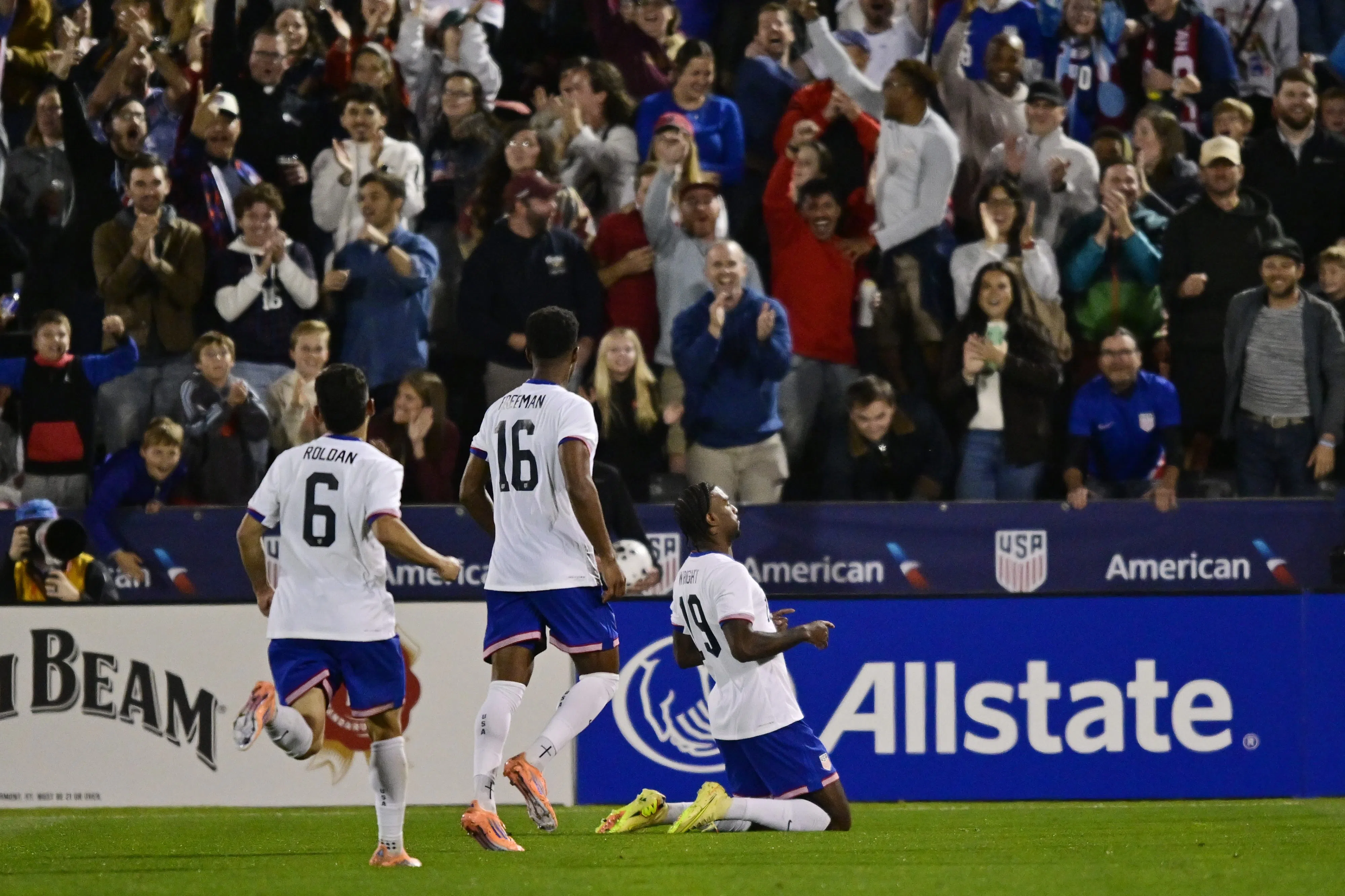 COMMERCE CITY, COLORADO - OCTOBER 14: Haji Wright of United States celebrates after scoring his team's second goal with teammates during the International Friendly match between United States and Australia at Dick's Sporting Goods Park on October 14, 2025 in Commerce City, Colorado. (Photo by Dustin Bradford/Getty Images)