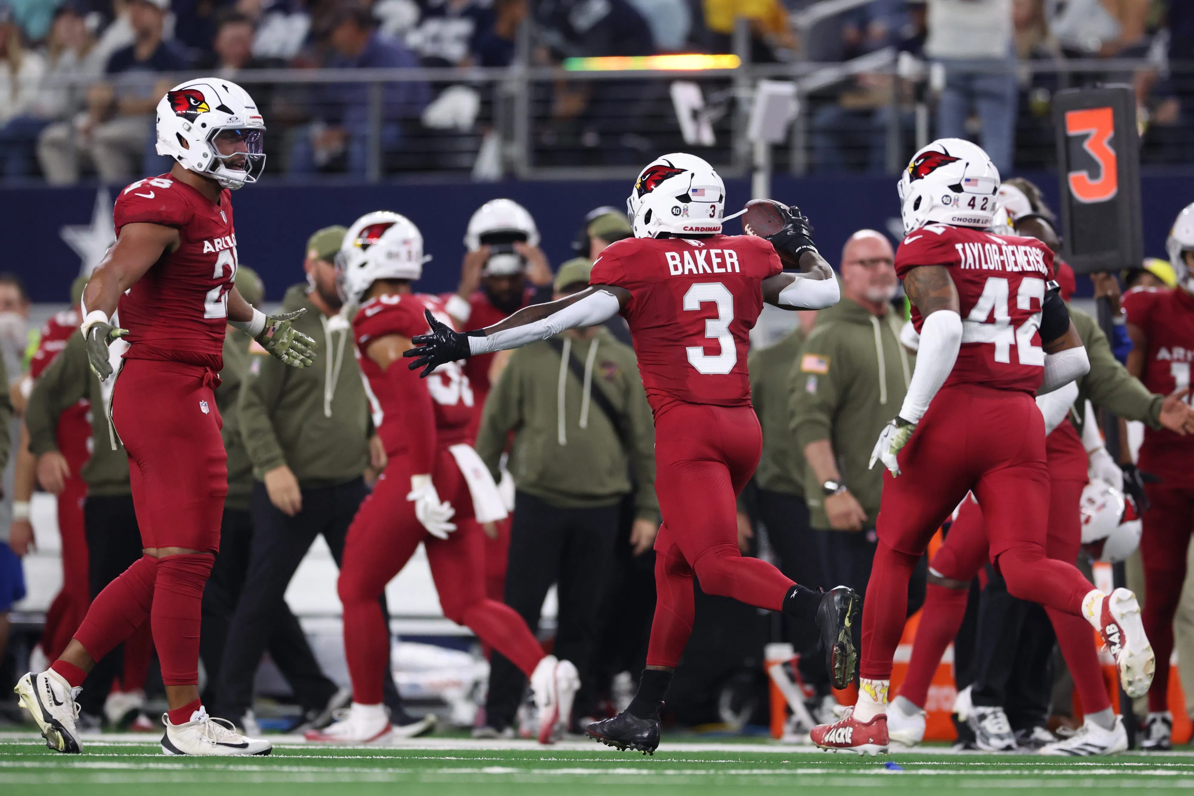 ARLINGTON, TEXAS - NOVEMBER 03: Budda Baker #3 of the Arizona Cardinals celebrates a fumble recovery against the Dallas Cowboys during the second quarter in the game at AT&T Stadium on November 03, 2025 in Arlington, Texas. (Photo by Sam Hodde/Getty Images)