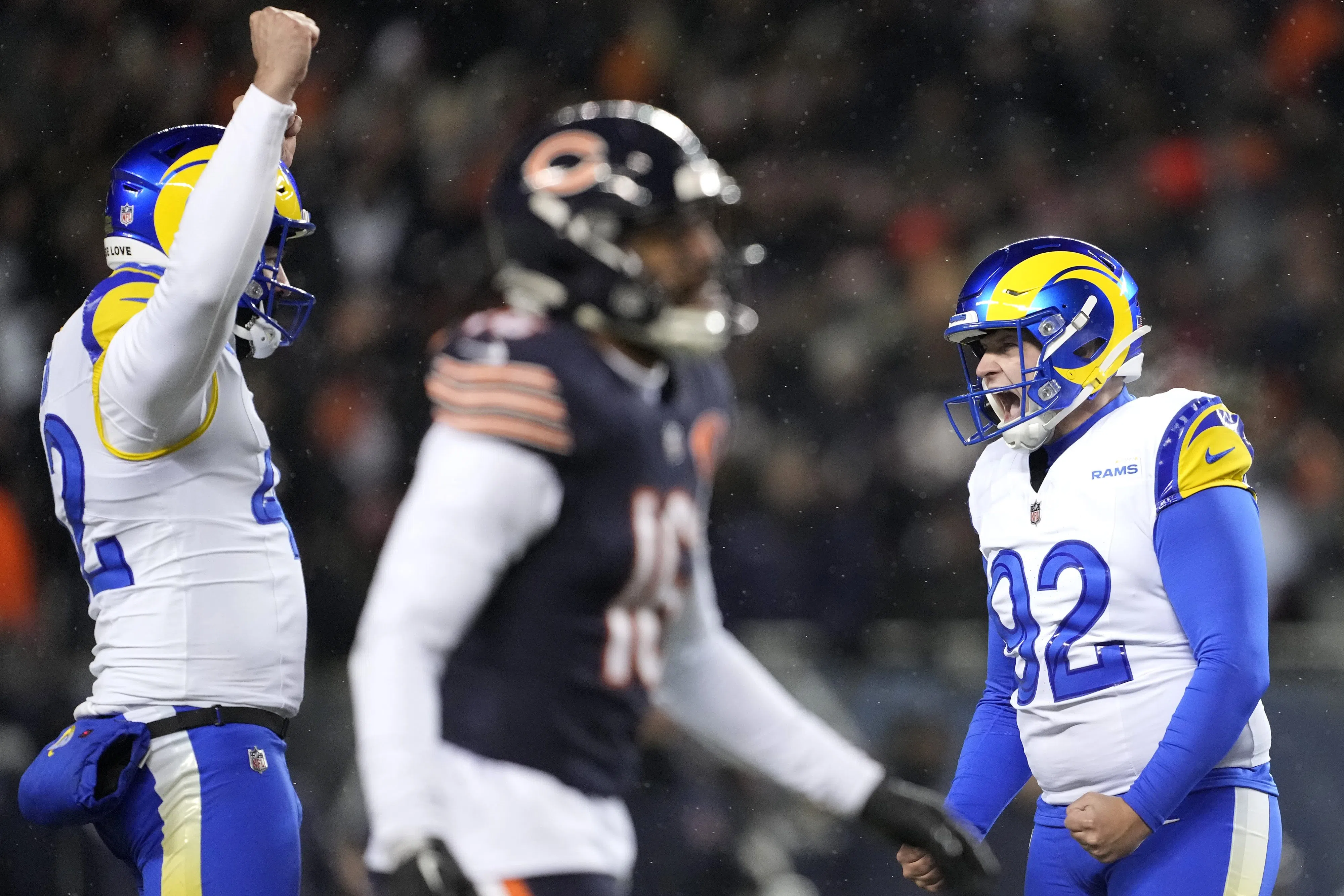 WWO Sports Jan 18, 2026 CHICAGO, ILLINOIS - JANUARY 18: Harrison Mevis #92 of the Los Angeles Rams celebrates with Ethan Evans #42 after kicking the game winning field goal against the Chicago Bears during overtime in the NFC Divisional Playoffs at Soldier Field on January 18, 2026 in Chicago, Illinois. (Photo by Patrick McDermott/Getty Images)